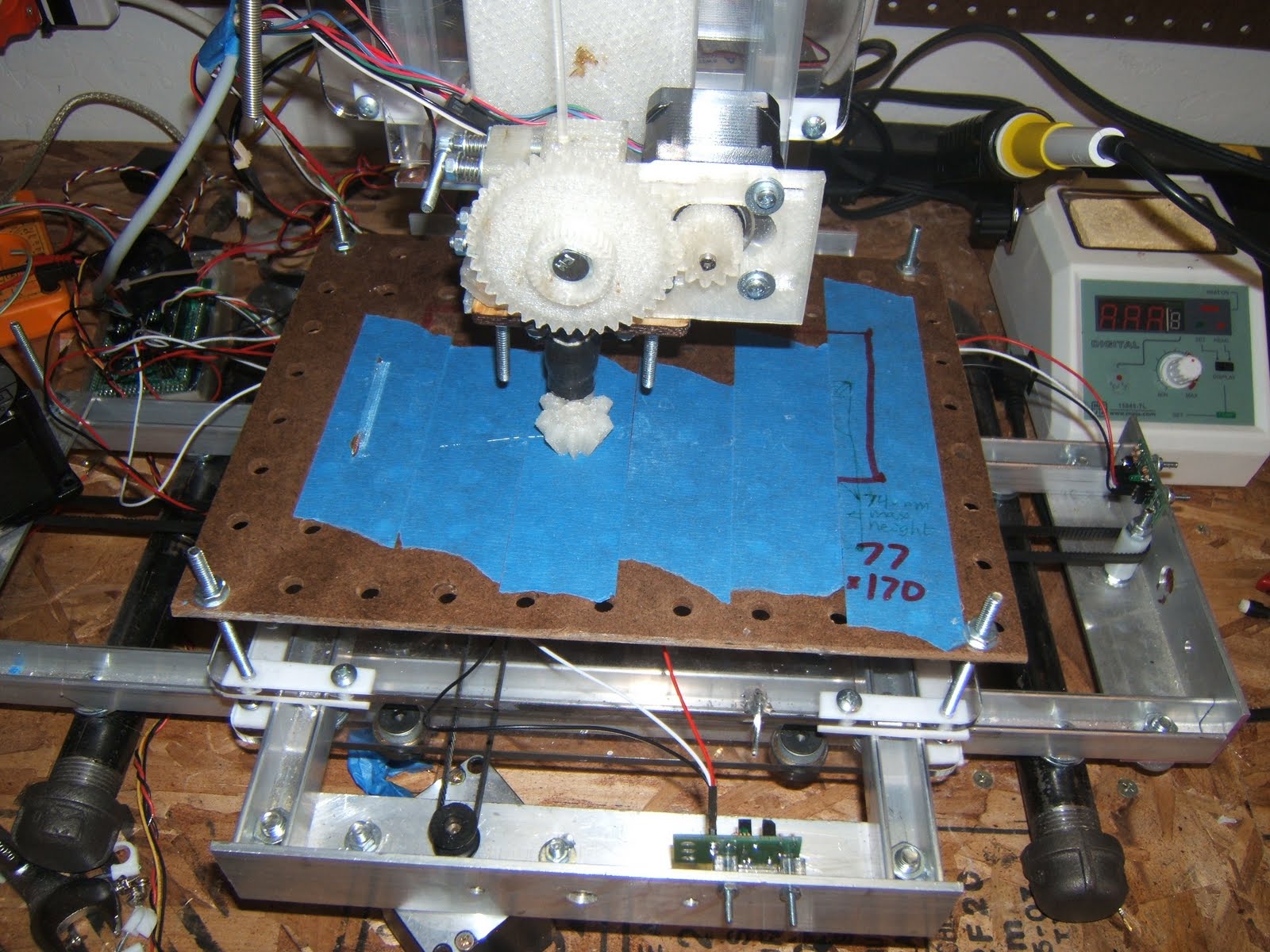 Here you can see the electronics set-up. I am using Gen 2 electronics. Eventually I plan on upgrading to an Arduino Mega with Pololu stepper drivers. For now this is working well, however.